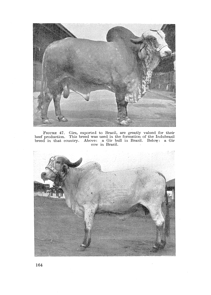 The color of the Gir, as accepted in Brazil, is red, white, red and white with spots, or yellow. ,It , is the conformation of the Girs which is prized most by the breeders, though, for beef production, the animals are on the smaller side. In appearance they are strikingly impressive. In Brazil, Gir cattle are utilized to produce beef on grassland feeding alone. It is observed that the females usually calve for the first time when they are about 39 ‘months old and that they mature sexually earlier in Brazil than in India, although exact data are lacking. There is no fixed breeding season and the animals are ready for mating in any season. Bulls are ready for service at the age of 2 years, having. an active breeding life of 8 to 10 years. In experiments carried out at the Experimental Breeding Center of Sertaozinho, it was noted that the dressed meat percent- age from Girs amounted to 62.1 percent. At the same centre it was observed that 2-year-old bullocks from Gir crosses weighed 1,195.3 pounds. It is noted (Anonymous, 1949 (b)) that from two lots of 5 Gir-cross cattle each, the average weights at slaughter were 842.5 and 833.7 pounds while the cold carcass weights were 495.2 and 496.1 pounds. It it noted from a study in Brazil (Veiga, 1945) that Gir cattle have a hereditary recessive sub-lethal factor of flexed limbs. Though no exact studies are available, the foraging capacity and resistance to tick-borne diseases amongst Gir are favorably regarded by breeders. Purebred Gir cattle are maintained at the Government Experimental Livestock Breeding Station near Uberaba for improvement and research. The station is located in a zone of tropical climate of semi-humid type having around 2,330 hours of direct sunlight in 12 months. The mean temperature is 70°F during the dry season and 74°F. during the rainy season. Of these two season, August is the driest month in the year with 55 percent of relative humidity : January being the most rainy month with 12.8 inches of rain. Annual rainfall in the region is 64.4 inches; the region has on average 125 days of rain during the year. The breeding season is planned to begin on 1 May and continues until the end of January : consequently, the calving season starts in the middle of February and continues through to the first half of November. Cows are allowed to calve in previously chosen pasture grounds and the calves are nursed by their Mothers. When the calves are about 81/2 to 9 months old, they are weaned and separated into sex groups, at which time bull calves are put on an additional feeding schedule which is a mixture of ground feeds having millets, rice or wheat bran and cottonseed meal with approximately 14 percent protein. Bulls are allowed to breed when they are 24 months old. Similarly, heifers are allowed to be bred When they are 24 to 27 months old In an experiment conducted at the Animal Genetics Laboratory in SA° Paulo to find out the influence of the environmental temperature on body temperature, it was observed that Gir cattle (average of 6 animals) registered average body temperatures of 101.0°F. and 102.0°F. when the atmospheric temperatures were 70.5°F. and S7.0°F. This may be compared to the body temperatures of European breeds of cattle (average of 89 animals representing 6 breeds) 101.0°F. and 103.5°F. when atmospheric